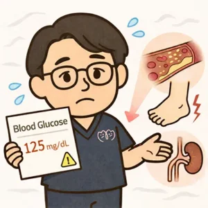 血糖値が正常より高い状態が続くのは、糖尿病の前段階である「糖尿病予備群」の可能性があります。たとえば、空腹時血糖値が110〜125mg/dL、HbA1cが5.6〜6.4%の範囲にある方は、すでに注意が必要です。予備群の段階では自覚症状がないため、軽く考えてしまう方も少なくありません。しかし、放っておくと少しずつ血管や神経に負担がかかり、気づかないうちに糖尿病が進行してしまうことがあります。糖尿病が進むと、目の病気や腎臓の障害、手足のしびれ(神経障害)など、さまざまな合併症を引き起こすことにつながります。
