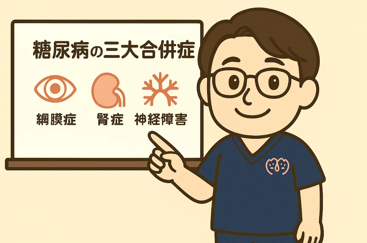 糖尿病の代表的な合併症は、三大合併症と呼ばれています。目の網膜に障害が起きて視力が低下する「糖尿病網膜症」、腎臓の機能が低下する「糖尿病性腎症」、手足のしびれや感覚の低下を引き起こす「糖尿病神経障害」の3つです。どの合併症も、初期段階ではほとんど症状がなく、気づかないうちに進んでしまうことがあります。とくに腎症は、痛みや違和感がないまま進行し、気づいたときには腎不全が進んでいるケースも少なくありません。